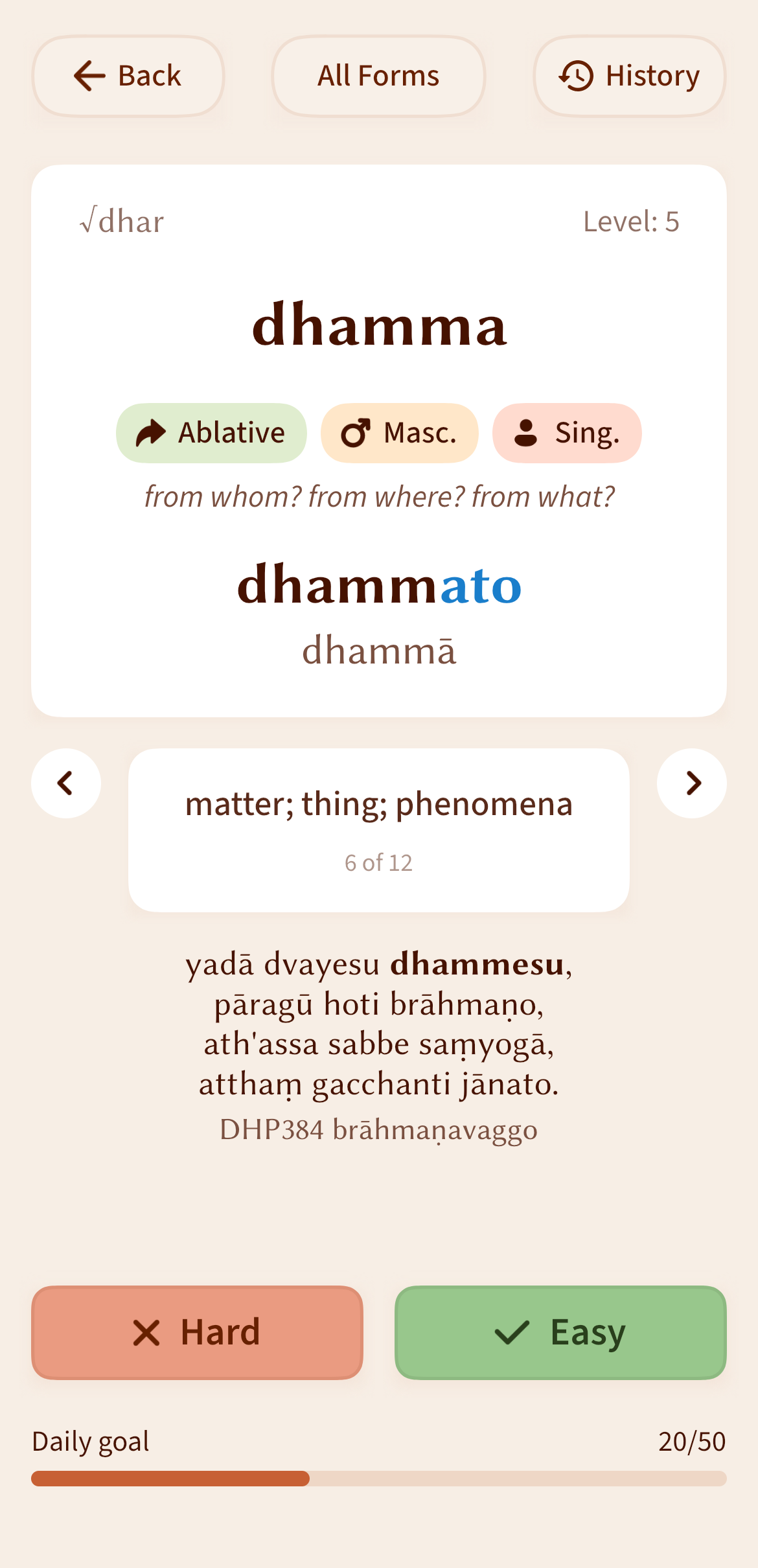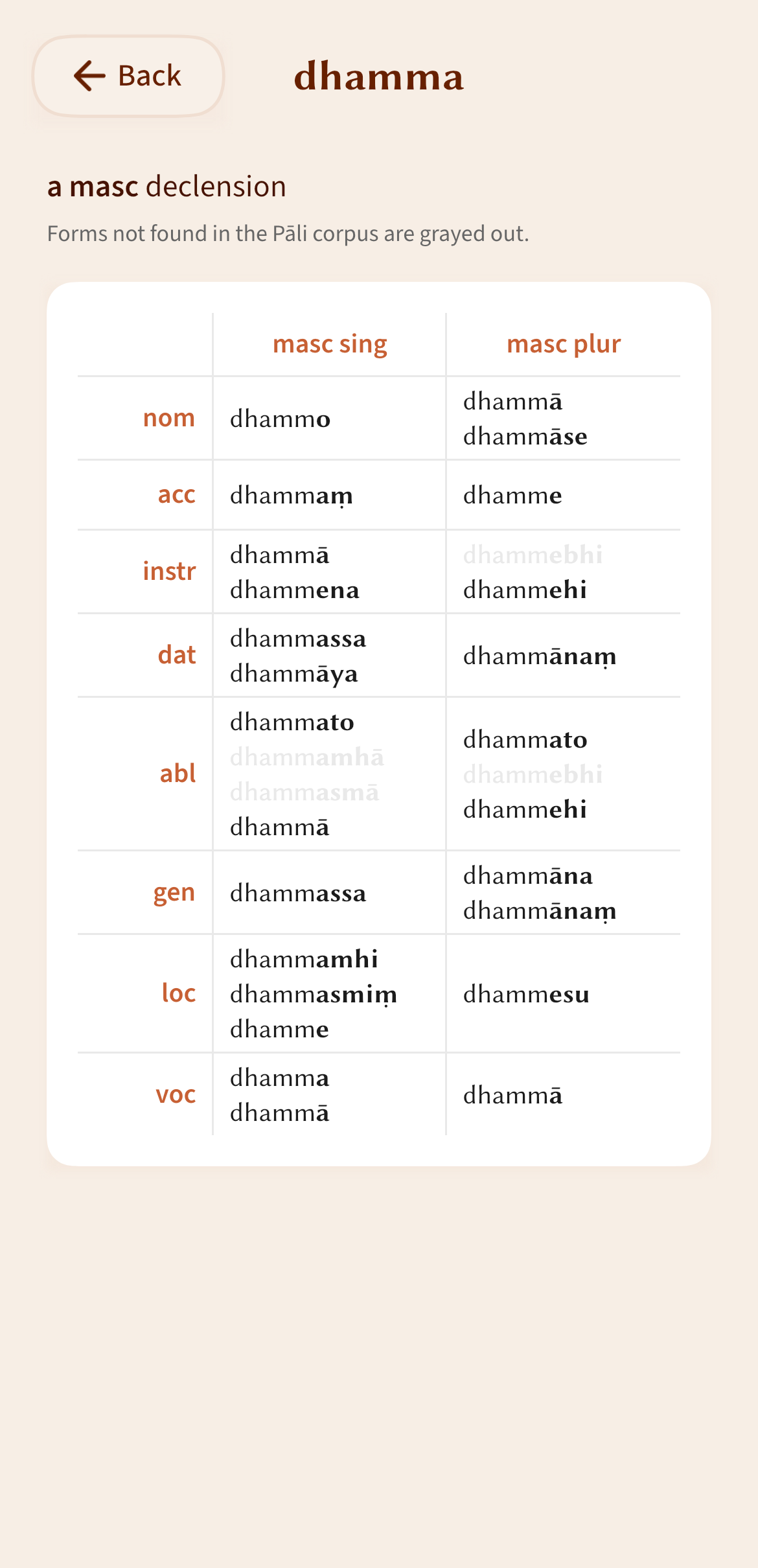 Free app for learning Pāli language grammar, with a focus on verb conjugations and noun declensions. Works fully offline and is available for computers, phones, and tablets.
